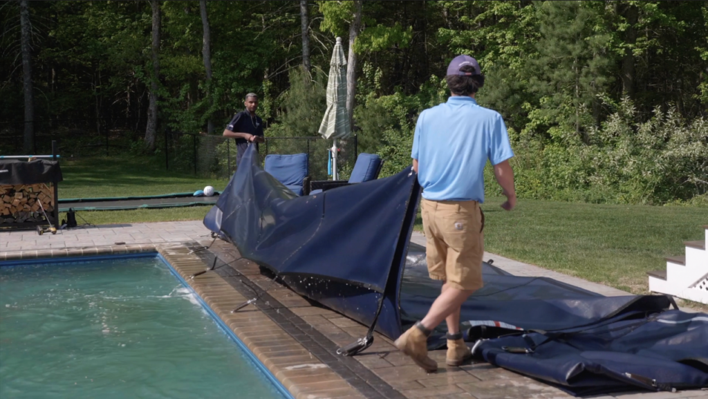 Your pool cover has protected your pool all winter, but it likely collected debris, water, and dirt. Carefully remove the cover to avoid dumping contaminants into the pool.